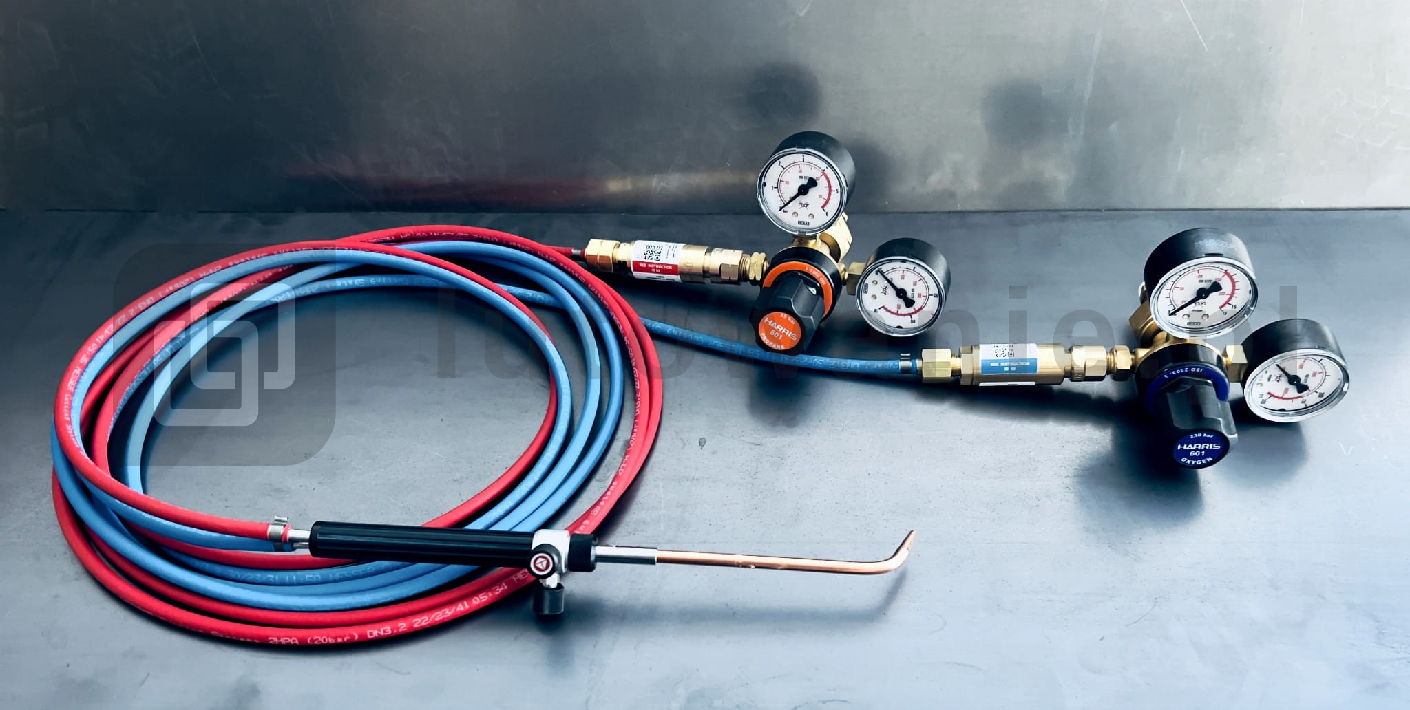 Gotowy do pracy, kompletny zestaw do lutowania twardego, miękkiego i podgrzewania. Zasilany propanem i tlenem oparty na przemysłowych komponentach renomowanych marek Harris oraz Messer.